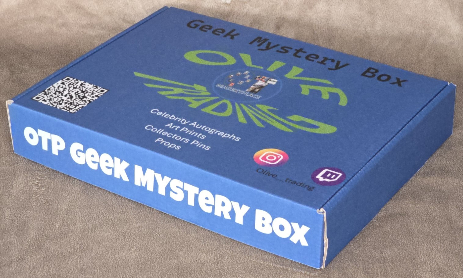 A collectors dream, a box with an assortment of collectibles. The box includes an 8x10 celebrity autographed photo with COA, an 8x10 art print, and a mix of three collector pins or two collector pins and a prop item. The box may include a special drop item. Picture shows a sample.